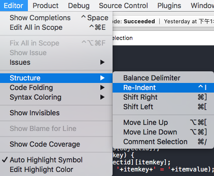 選擇要自動縮排的程式碼範圍,接著點右鍵 (或 Editor) > Structure > Re-Indent