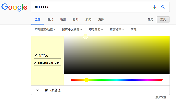 例如想要知道「#FFFFCC」看起來如何,直接搜尋就能看到顏色了