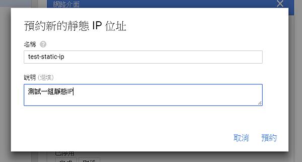 例如輸入test-static-ip ,說明寫一組讓自己看的懂得內容,描述這組IP的用途或目的
