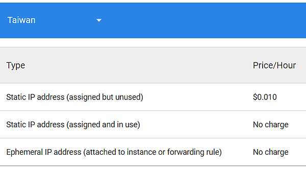 最新即時的費用說明請參考 https://cloud.google.com/compute/pricing#ipaddress
