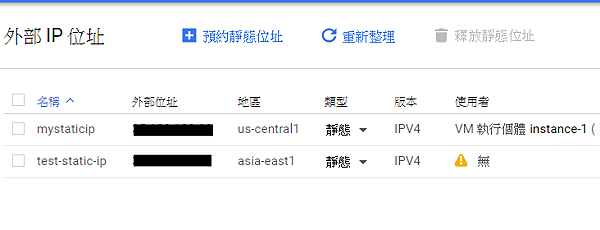 例如test-static-ip顯示為RESERVED (保留),表示該IP被預約但沒有使用,此時就會收取費用了