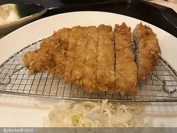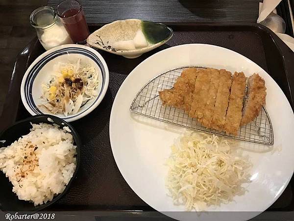 附有醃蘿蔔跟開胃醋,豬排厚度很夠也很大片,配上高麗菜絲,算是中規中矩